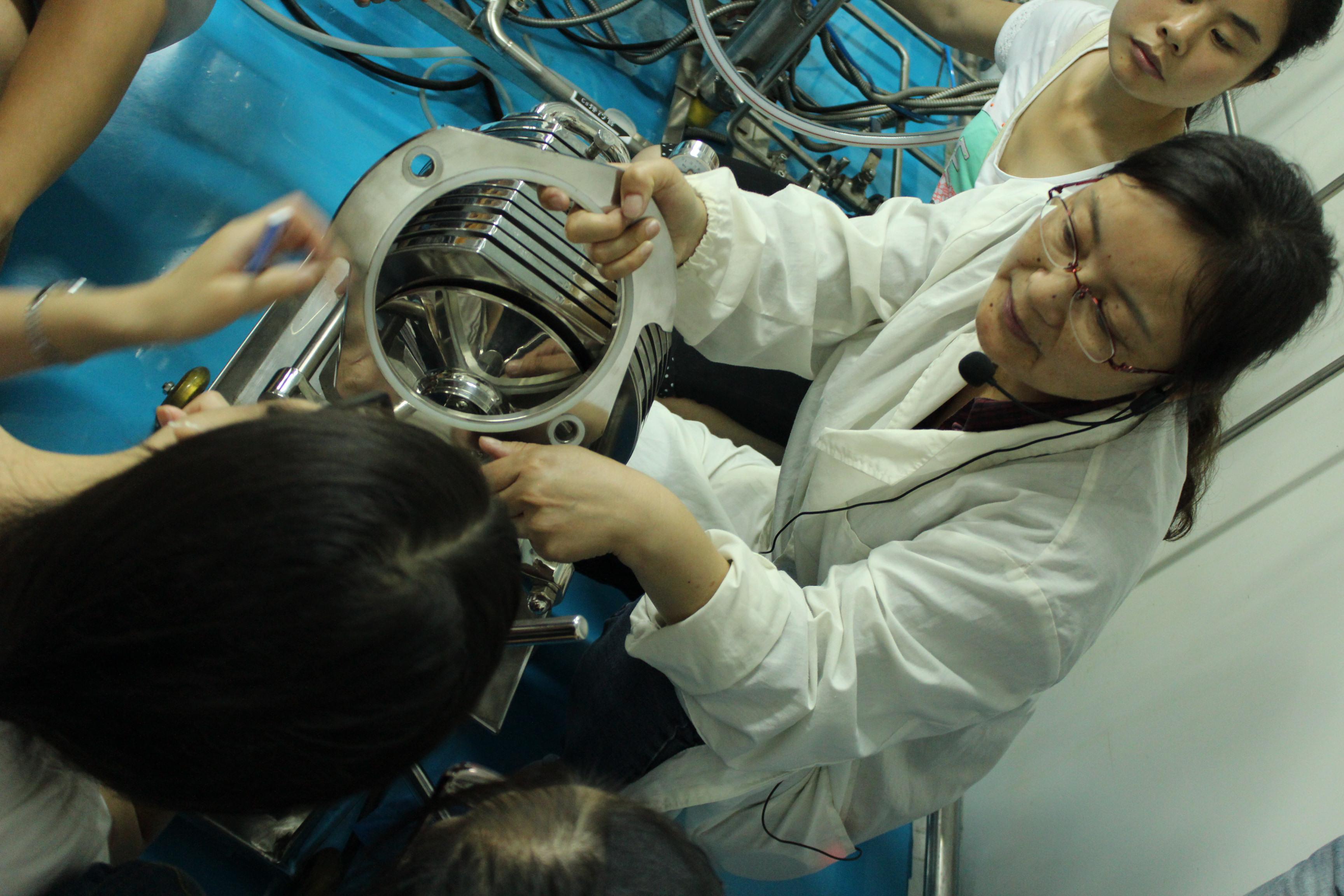 学生参与压片机的拆卸与清洁工作