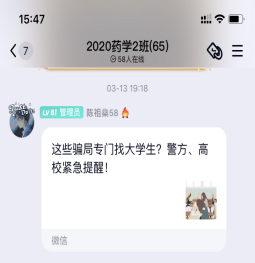 辅导员结合近期全国高校金融诈骗的情况,向各班推送了全国高校“防骗”专项通报,内容包括广西大学学生被自称“淘宝客服”以产品问题可退三倍赔偿款为由,诱导QQ屏共享、下载借贷软件、转账等操作。在推文中,警方列举了三个案例:分别是“网络刷单返利”、“网络购物退款”、“免费领取礼品”等,同时警方还提醒大学生要注意网上兼职、网上投资、网络中奖等各样诈骗套路。其中大学校园中的“校园贷”主要有三种形式:1、“免抵押、低利息”为诱饵诱导学生放款,需缴纳贷款手续费、管理费、保证金等费用;2、声称通过培训提高综合技能,夸大培训效果,签订合同,诱导学生贷款支付费用;3、与兼职诈骗结合,要求学生贷款购买手机等产品做“销售代理”;以及冒充老乡、老师等。