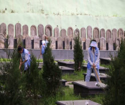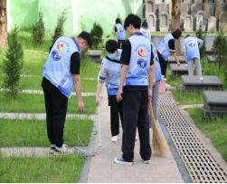 (志愿者认真打扫陵园)