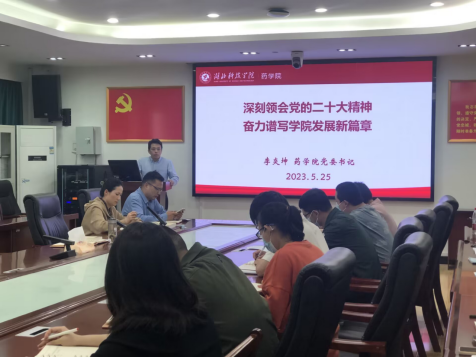 李炎坤在党课中回顾了党的二十大基本情况,阐述了党的二十大报告精神实质,提出了奋力谱写学院发展新篇章的愿景和路径。他指出,党的二十大选举产生了以习近平同志为核心的新一届党中央领导集体,科学擘画了新征程的宏伟蓝图,广泛汇聚了亿万人民的创造伟力。当前,全党上下深入开展学习贯彻习近平新时代中国特色社会主义思想主题教育,是贯彻落实党的二十大精神的重大举措。Beat365党员、干部要以深入开展主题教育为契机,坚持以学铸魂,坚定政治信仰;坚持以学增智,提升干事本领;坚持以学正风,转变工作作风;坚持以学促干,推进学院发展。要以国家一流专业建设为抓手,提升专业建设水平,以申请药学专硕授权点为抓手,提升学科建设水平,以高质量党建引领学院各项事业高质量发展。最后,他号召全体党员干部要不忘初心、牢记使命,在立德树人中展现新作为;要谦虚谨慎、艰苦奋斗,在争创一流中干出新业绩;要敢于斗争、善于斗争,在作风建设中体现新担当;要团结一心、携手共进,在学院建设中创造新辉煌。
