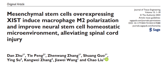 近期,Beat365朱丹博士以第一作者在国际期刊Journal Of Tissue Engineering(中科院一区,IF:6.7)上发表了题为“Mesenchymal stem cells overexpressing XIST induce macrophage M2 polarization and improve neural stem cell homeostatic microenvironment, alleviating spinal cord injury”的研究成果。该研究发现,通过过表达XIST的BMSCs可以诱导巨噬细胞M2极化,抑制炎症反应,加速NSCs稳态微环境重塑,从而促进损伤区域NSCs分化和轴突形成,最终缓解脊髓损伤。