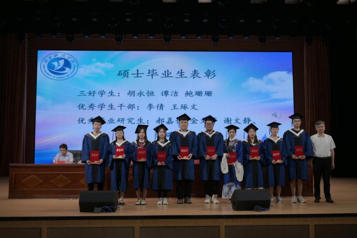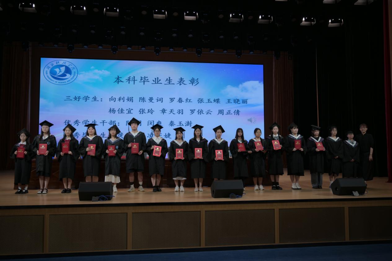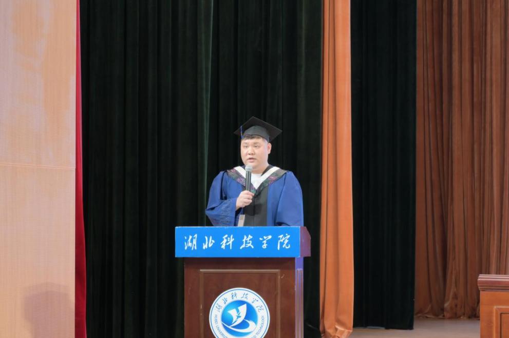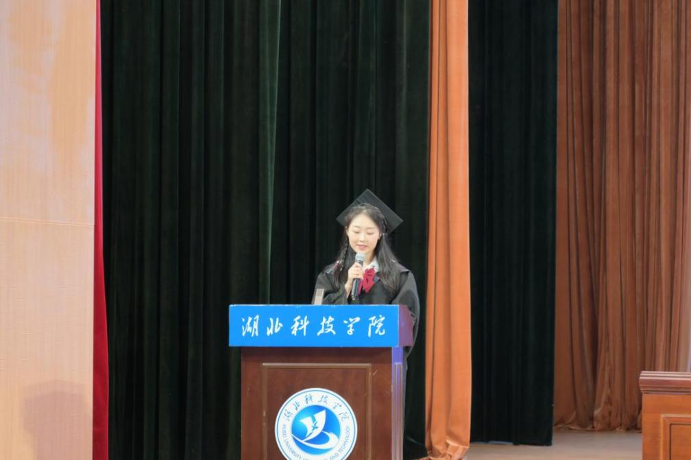 郝嘉伟、庹悦婷分别作为2023届研究生、本科毕业生代表发言。在发言中,他们分享了自己的学习心得,面对未来的道路,始终铭记“博学、弘德、敏行、敢先”的校训,心怀感恩,勇往直前。庹悦婷勉励学弟学妹们:“路漫漫其修远兮,吾将上下而求索,未来的道路遥远而漫长,希望同学们不畏艰难险阻,去追求和探索自己的未来!”短短几分钟的发言,道不尽他们对友谊的珍视、对老师的感谢与对湖科的留恋。